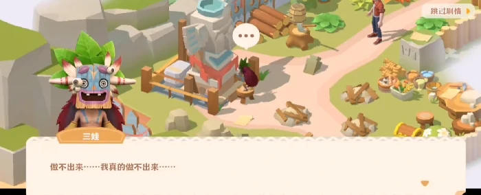 帮妮娜建好房子,走到造型特别的土著雕像附近,与三位土著居民交谈,得知他们要完成雕像但缺木材。在附近废墟地选择“收集”,获取60个木头,协助完成雕像,土著加入岛屿。