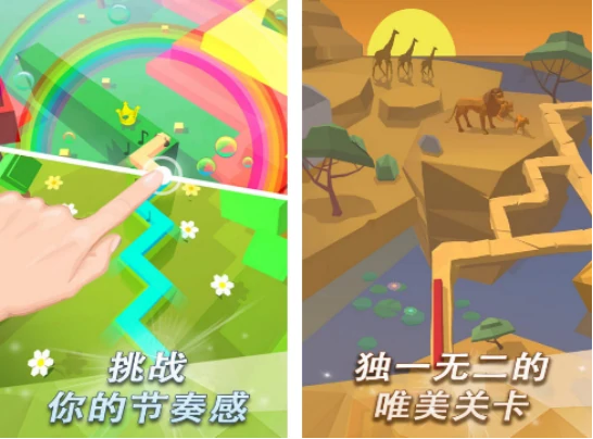 游戏考验节奏,设精致关卡。操控变色灵活线条,抓准时机点击滑动,通过各阶段。融入精选乐曲,配合操作节奏,听音乐时点击屏幕引导线条前进。视觉听觉高度结合,挑战完美通关!