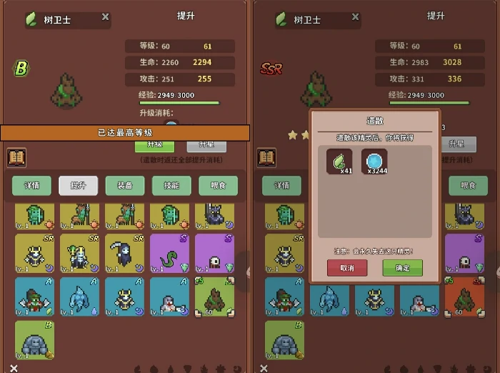B阶精灵1级升至60级消耗1828经验球,进阶SSR后分解回收3244经验球,经验收益放大1.77倍,适合后期快速积累经验
