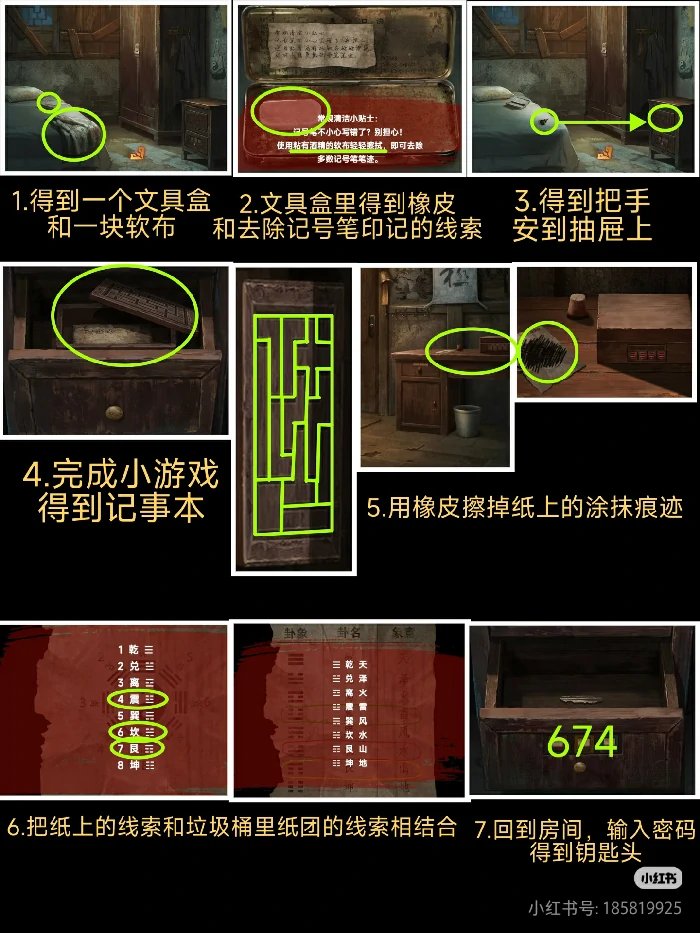 6. 解八卦密码:坎6+艮7+震4→输674开抽屉取断钥匙,与桌面活塞组合成简易钥匙