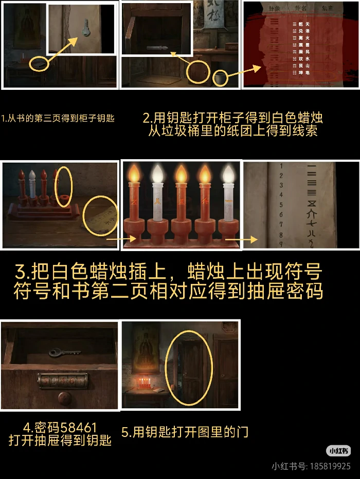 4. 开柜子取白色电子蜡烛放供桌,看蜡烛字符+书中线索→输密码58461开抽屉得青铜钥匙
