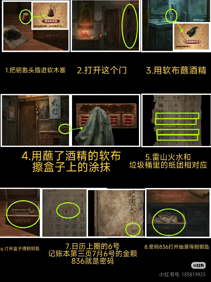 8. 简易钥匙开浴室门,酒精泡枕巾成酒精枕巾,回外桌擦盒子,按纸条选震→艮→离→坎,拿第二把古铜钥匙