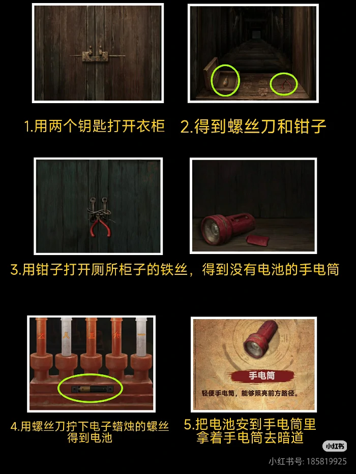10. 供桌烛台用螺丝刀拆电池,浴室柜用尖嘴钳装电池得手电筒,进入暗道