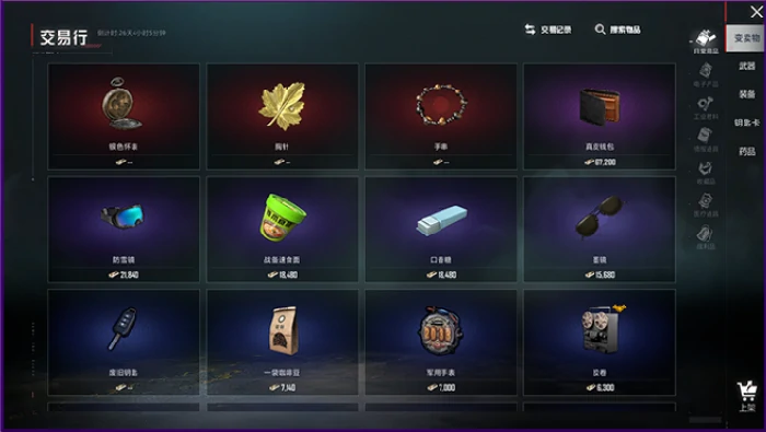 进入地铁大厅,界面右下角找到交易行入口。商品分变卖物、武器、装备、钥匙卡、药品五大类,可分类筛选或搜索查找。注意:购得的变卖物绑定,不可再次上架。