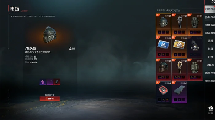 同步上线限时兑换商店,赛季活动形式开放。商品定期更新且有兑换次数限制,含能源电池、7级防具等高级物资,可用指定变卖物兑换特殊道具,提升资源利用率。
