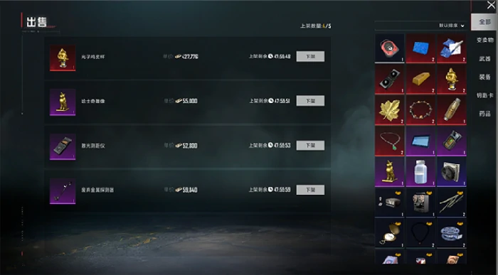 出售个人仓库物资或自制药品,选择物品、设定数量与售价,确认后上架。商品售出系统扣佣金,所得地铁币邮件发放。玩家同时最多挂牌5件商品,流拍物品48小时后自动下架,可重新上架。