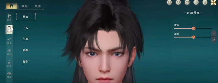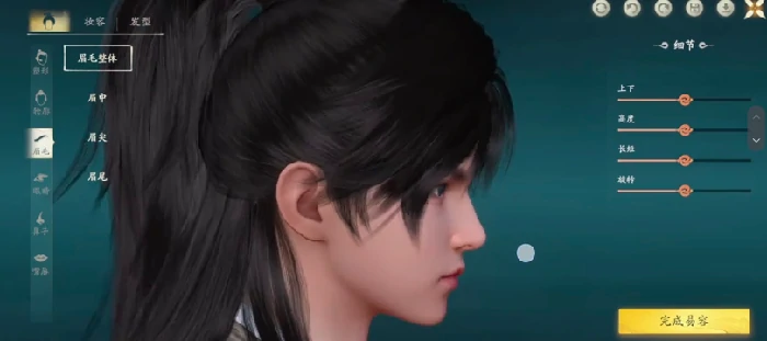 眉型选择:男性英气风配剑眉,提高眉峰,缩小眉间距,下移眉毛位置;柔和感微调默认眉型。