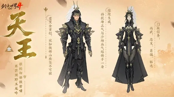 天王门派源自洞庭义军,设计融合军旅风格,武器原型为枪、盾,角色身着黑金铠甲,腰系龙形扣带。