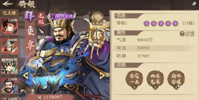 核心三人组:吕布+周瑜+黄忠。周瑜释放火系群体技能,附加灼烧持续消耗;吕布开怒气技能免控突进,打乱敌方阵型;黄忠远程多段攻击收残血。进阶加赵云、左慈,赵云借龙吟九霄技能在敌方减员后切入扩大优势。