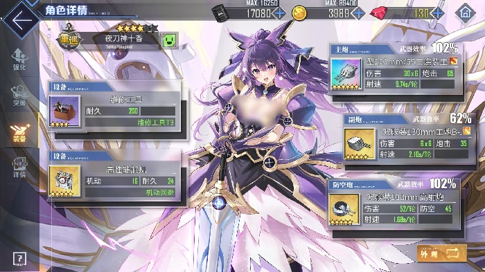 二技能偏重防御。战斗开始后每30秒获得可抵挡8发子弹的护盾,护盾持续期间免疫伤害,破裂后提升最高15%机动属性增强生存能力。同时,她在场时旗舰所受伤害降低10%,有效防范跨射和空袭等攻击,避免旗舰被击沉导致战斗失败。