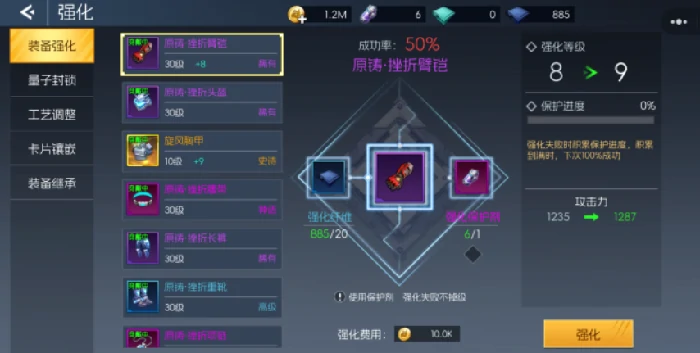 用强化保护剂防降级,失败不掉级还积累保护进度,满100%下次强化必成。