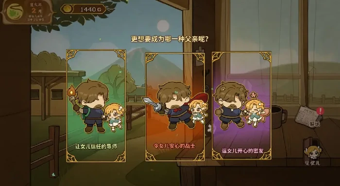 女儿进入夏火年至冬火年,每隔两回合触发心事事件。玩家需选择父亲形象:导师(侧重睿智)、战士(强调勇敢)、密友(突出可爱),同时维持“爸爸很爱我”数值。最终评价含主要标签与隐藏负面词条,全成就玩家需提前规划选择。