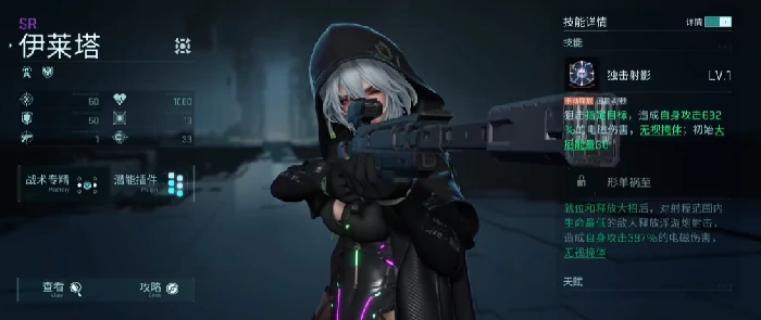 伊莱塔操作门槛低,人物设计精致。后期数值不严重失衡,稍培养就实用。SR品质,前期实战稳定,不易出错。核心技能突击射影,狙击状态触发,对指定目标造成自身攻击力692%电磁伤害,无视敌方掩体。初始消耗30点大招能量,可远程突破高级掩体对手。