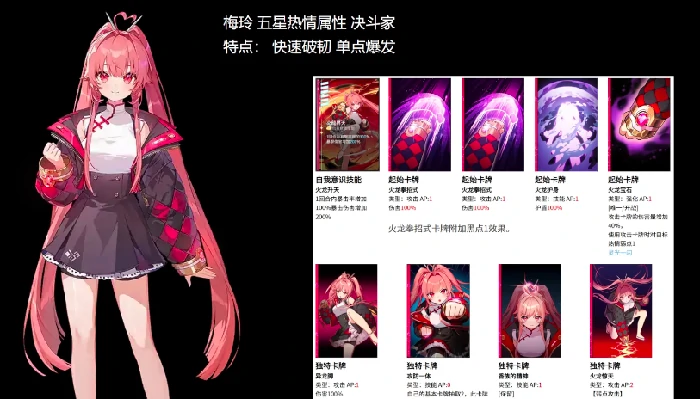 梅玲人称粉毛妹,简单暴力。配队门槛低,输出亮眼,快速破韧,高额伤害。核心被动余烬,敌人处于该状态,按层数提30%受击或破韧伤害,触发消耗一层,最多叠5层。持续附加敌人负面状态。卡牌带两张攻击、一张护盾牌,初始能力卡提40%攻击伤害。