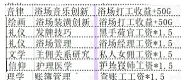 课程优先级:①账簿管理②主仆关系研究③护理医学④发牌技巧⑤浴场管理,浴场音乐创新与装潢创新可视情况获取。