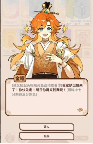 触发金曜陨落结局解锁。初次相遇确保悟性≥4(含装备、功法加成),选择拒接;悟性不足选拒接则无法进商店并中断流程。后续按剧情推进,最终选前去求证达成。