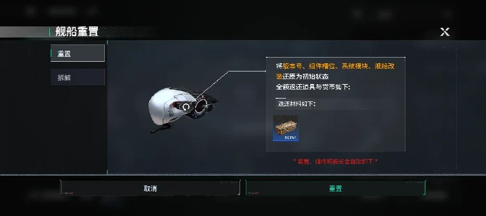 舰船/武器拆解重置:进武器装配界面,点对应按钮,秒进资源返还页,材料轻松拿!