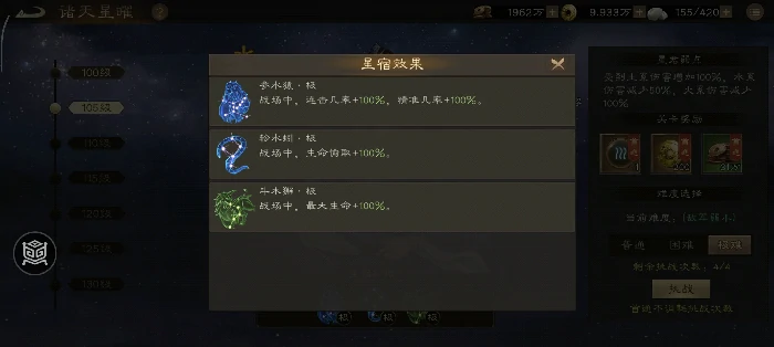 诸天星耀105级郭嘉极难模式挑战要点:敌方郭嘉高输出、持续压制怒气,后排集火易减员,且全体带100%吸血星宿效果。