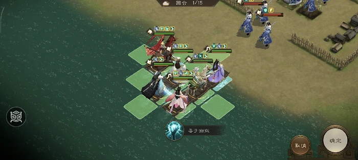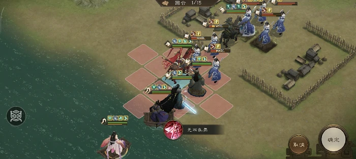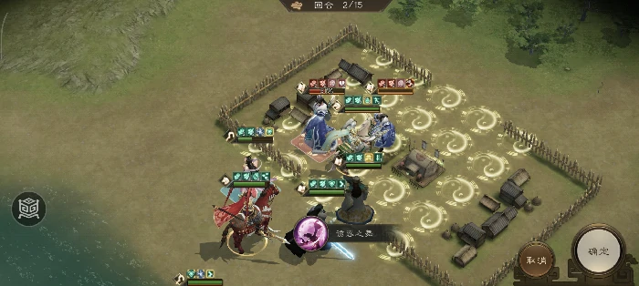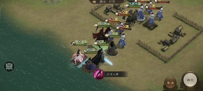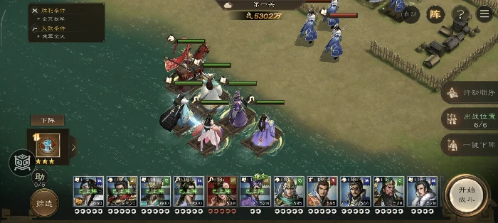 第一回合操作:甄姬开盾抗伤,诸葛亮吹风清减伤,郭嘉降抗性,赵云卡后排位置限制行动,吕布群攻,貂蝉让吕布再动灭前排。