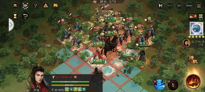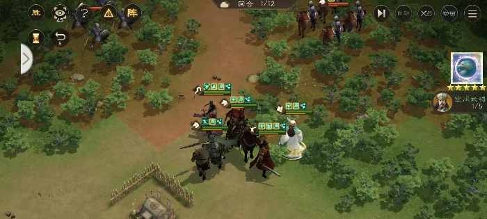 战场地形两侧树林、中间通路,敌军分三波据两侧及后端。避初期正面交锋,高练度玩家灵活调整。首回合全军退至图一位置,诸葛亮林中释风系技能,全员添增益,为次回合八卦阵备。