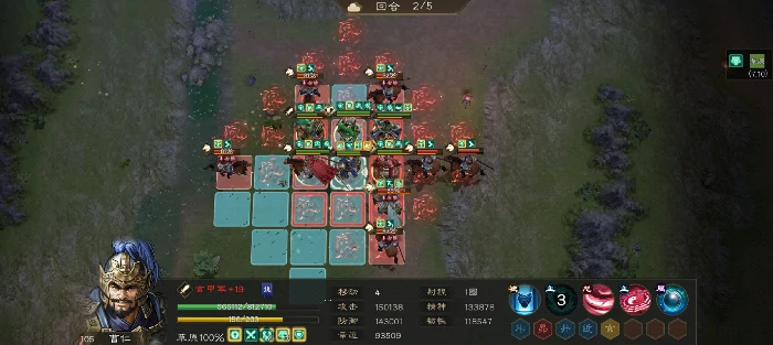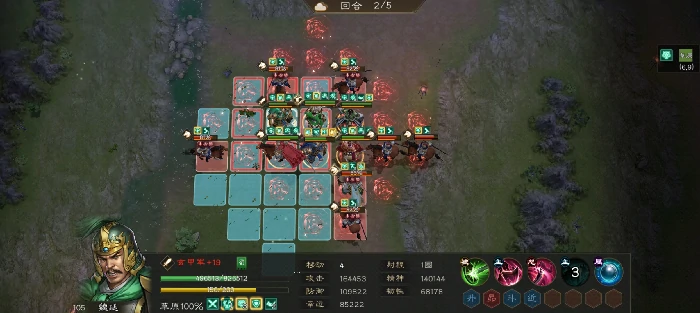 回合操作:第一回合全员上增益,曹仁倒数第二个行动,魏延最后行动并给曹仁上技能。