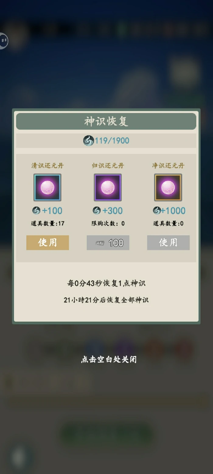 神识界面:每日8点刷新5枚中体力丹,单颗回300点,消耗100代金购买。