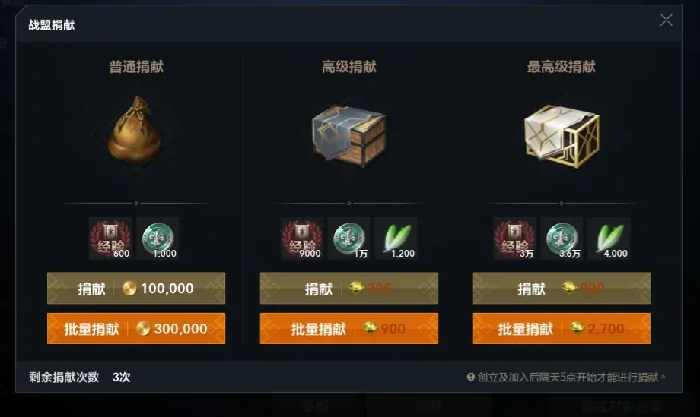 登录后系统自动签到,捐献需手动完成。每日最多捐献3次,基础为金币捐献,每次10万金币,可获得战盟经验与名誉勋章。钻石捐献提供更多经验和勋章,并额外赠送殷海萨恩宠。