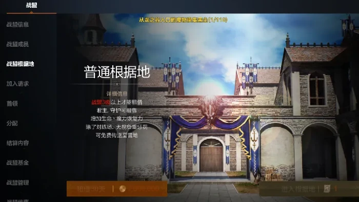 战盟等级达到3级后,君主与守护者可购买战盟根据地。成员在其中可加速生命与魔力恢复。玩家还可在杂货商处购买“根据地返回卷轴”,在危险时快速传送回安全区域。