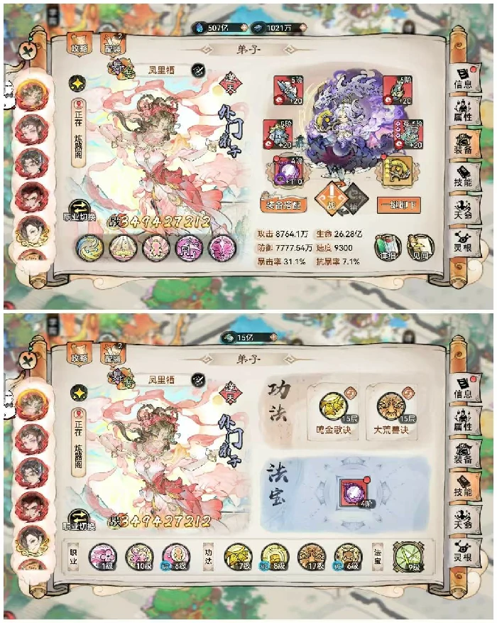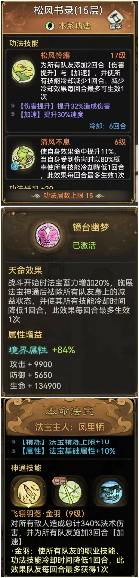 组合松风+囚龙。松风触发魔剑斩仙剑煞,获取再动机会。配合舞姬和四阶金羽毛法宝效果,频繁释放囚龙技能。
