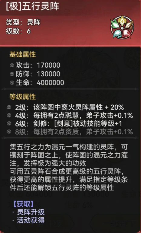 五行灵阵优先强化金属性威力及剑意等级,配置如下:
