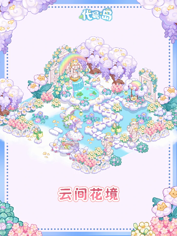 6云间花境:设计彩虹垂落装饰,种植花树,铺设云朵小径,营造仙境场景。