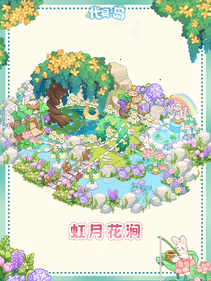 5虹月花涧:规划溪流环绕花丛,布置彩虹光晕装饰石边,打造童话山谷景观。