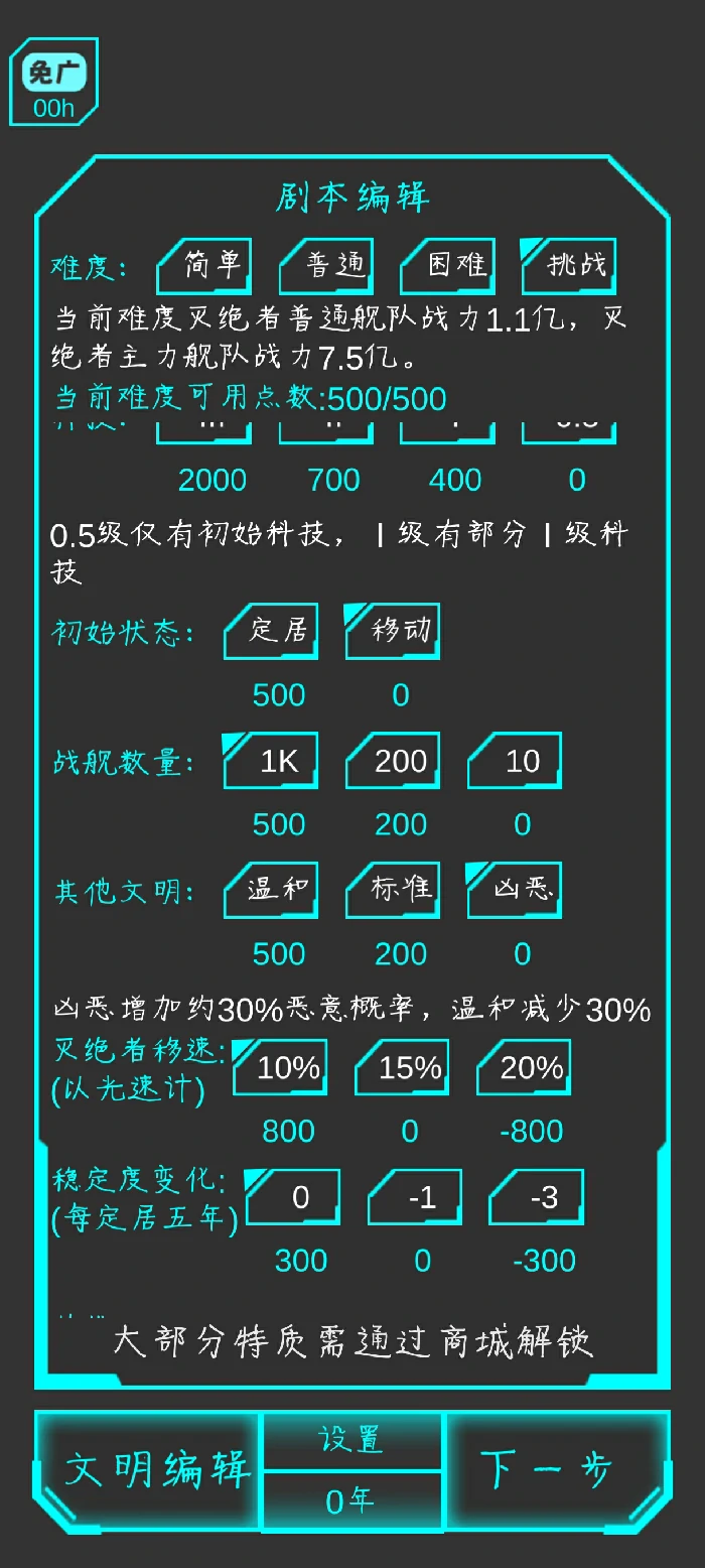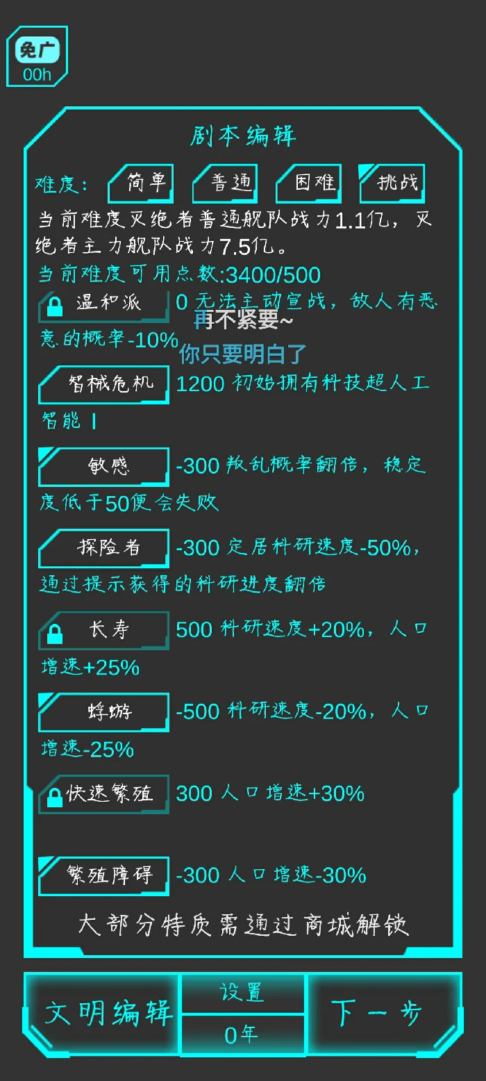 接受四大限制:遇文明立即敌对;人口上限减半且无法自然增长;稳定性低于50直接失败;科研-20%、人口增长-55%(后者可忽略)。