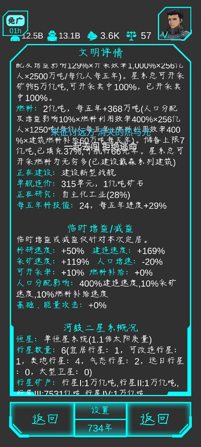 选星系时查矿产,能源储量确保12万吨以上(实际5万吨+就能用)。