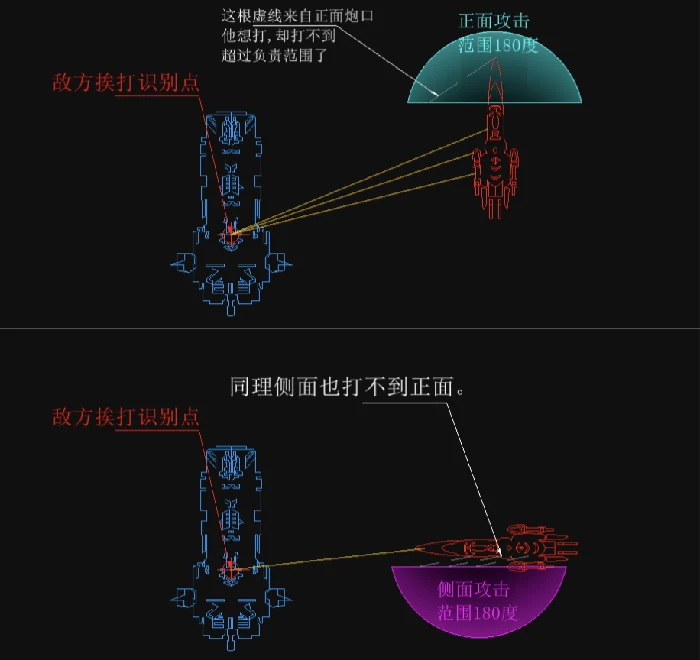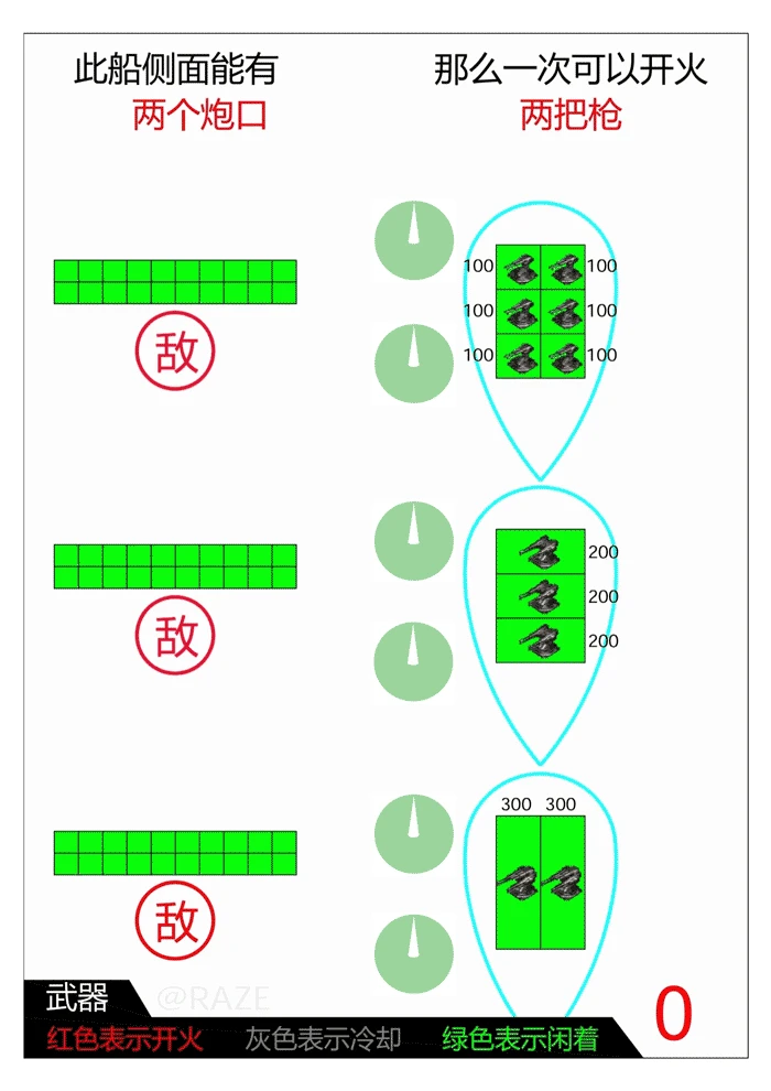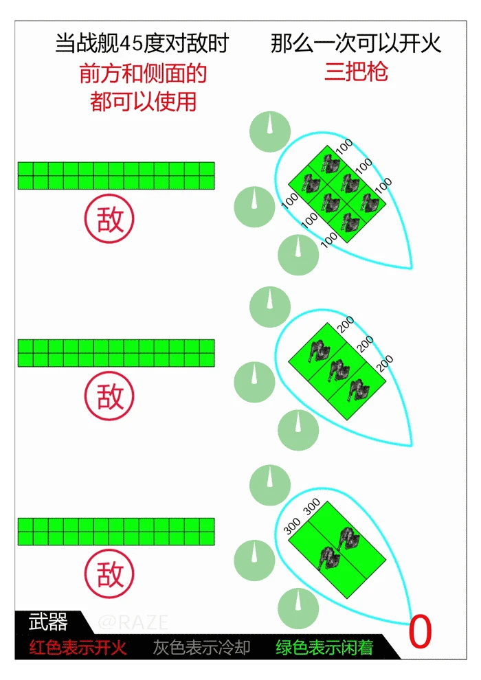战舰通常在前、左、右三个方向设炮口,无法向后开火,撤退时建议采取Z字形移动,保持火力覆盖。