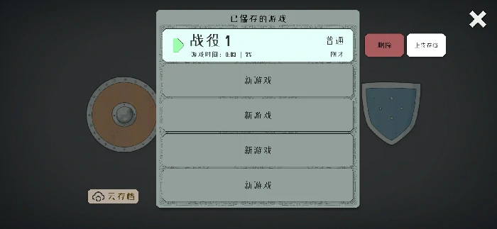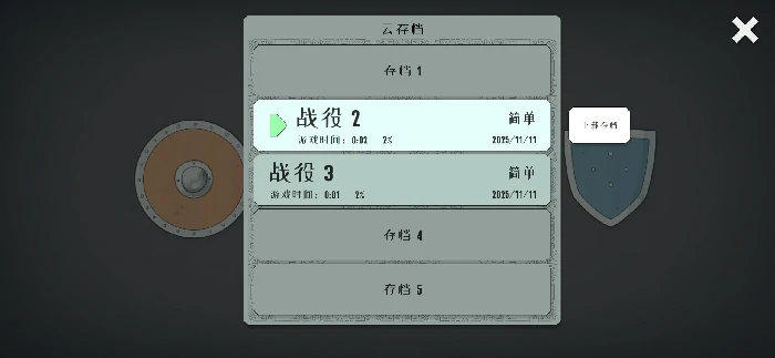 进入主界面,点击战役按钮,跳转存档选择界面,查看、挑选已存进度继续游戏,系统支持最多5个存档并行存在。