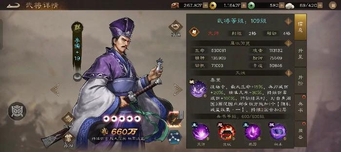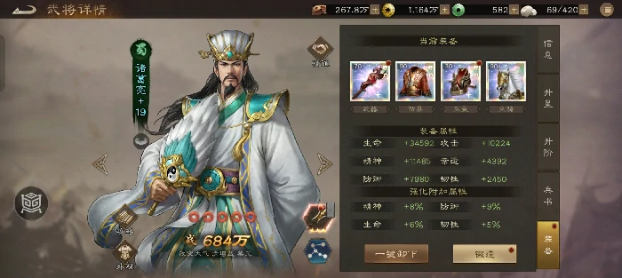诸葛亮穿上郭嘉的装备,搭配貂蝉的武器与吕布的神兵,确保其防御略高于郭嘉。
