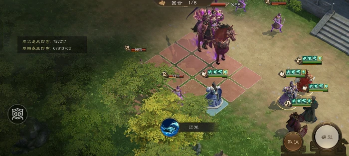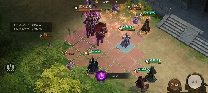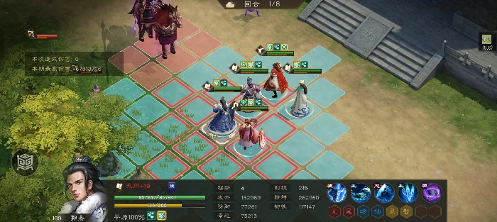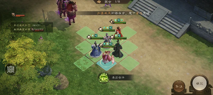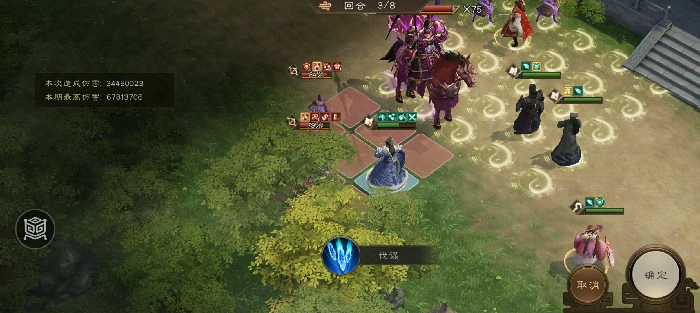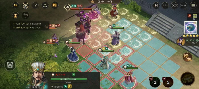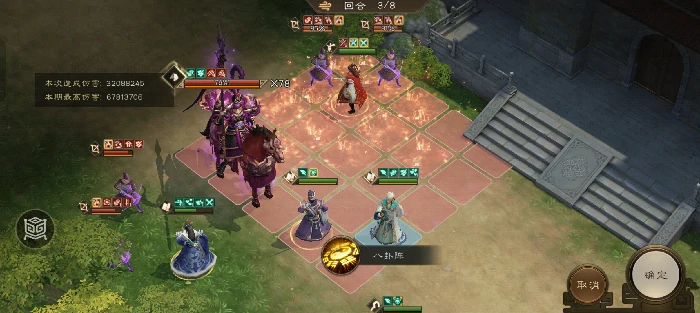 第三回合,诸葛亮使用八卦阵攻击上方敌人,李儒上移一格施放大招,郭嘉使用技能降低敌方怒气,周瑜施放水系技能。