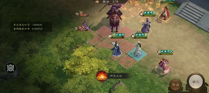 第二回合,诸葛亮施放火系技能,郭嘉前进一格发动大招控制小兵行动并保持站位不变,李儒向下移动一格继续施法,周瑜移至小兵中心开启大招完成固定卡位,小乔负责辅助与补位。