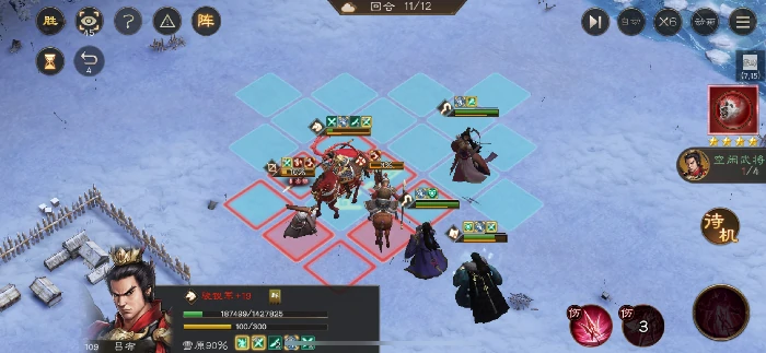 第三回合:全队右上移,聚最后1步所在竖列及右区;甄姬补吕布增伤,吕布避弓射程收残步,郭嘉近身普攻补刀,貂蝉曹操调位;敌方回合吕布反击削步。