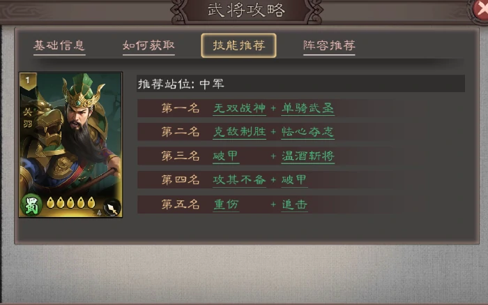 关羽定位主力输出兼半肉承伤,稳居游戏顶尖梯队。