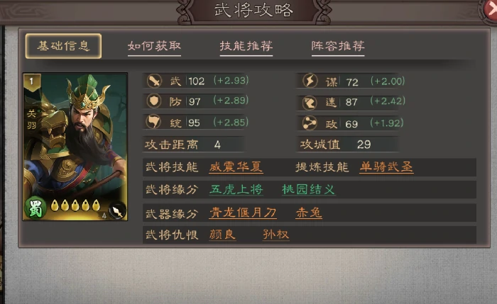 核心属性:初始武力102(每级成长+2.93),防御97(成长+2.89),攻防兼备面板保障高额伤害输出与中军位置承伤能力。