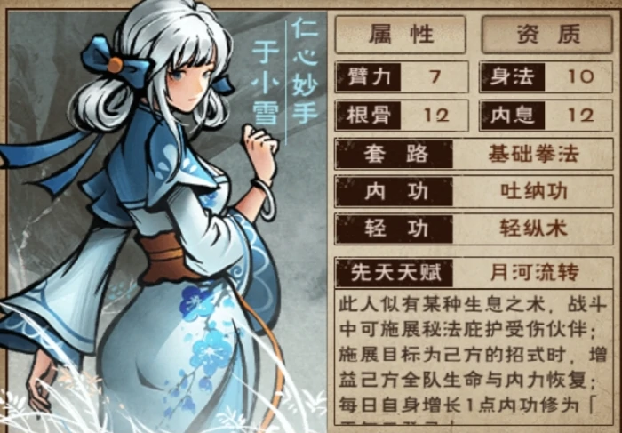 烟雨江湖于小雪武学配置:强化生存与治疗效率,选无暇棍法、龙象般若功、天一神功,配金仙、岐黄天赋。下面是详细方案。