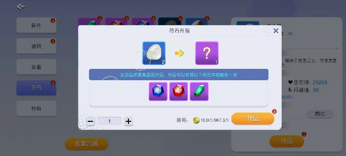 • 2颗紫色宝石 + 10万金币 → 合成1颗1星紫色宝石