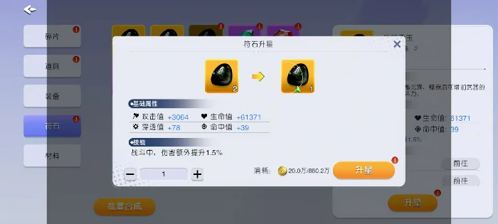 • 2颗1星橙色宝石 + 20万金币 → 合成1颗2星橙色宝石