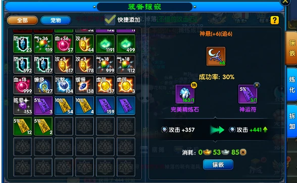 免费玩家,精打细算:绑定元宝优先换强化礼包,材料幸运符比单买划算20%+;市场买材料,留意玩家打包低阶材料,单份价低两成左右!