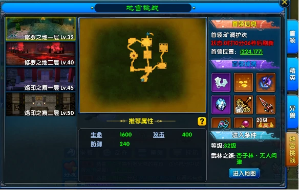 地宫分四层,难度、首领机制、奖励各不同,开启条件递增。一层修罗之地:32级+过武林之路・杏子林;二层:40级+通对应武林之路章节;三层:45级+推剧情;四层:50级+推剧情。按等级挑战,别硬刚。