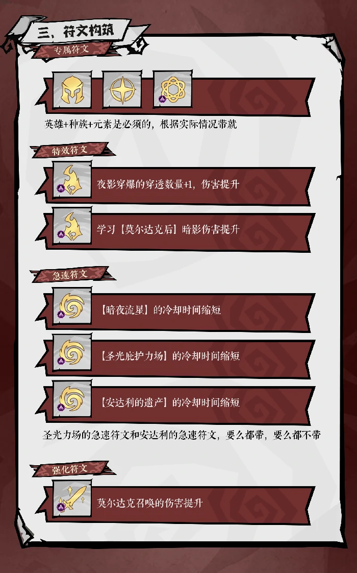 符文影响技能循环流畅度。优先配双急速符文,注意圣光庇护立场与安达利遗产的急速符文必须同步,要么都戴要么都不戴,防止技能释放节奏乱,破坏输出循环。缺急速符文时,先用增伤符文过渡,确保爆发期伤害无明显断层。