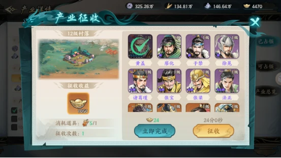 3.进行产业征收。对已占领村落征收,村落等级越高,单次征收元宝越多,12级村落每次超一千元宝。