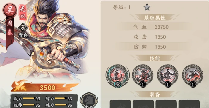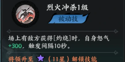 周泰定位肉盾,怒气技加反伤,觉醒后受技能攻击反伤倍率飙升,有机会眩晕目标。反伤伤害关联攻击属性,连携技在灼烧状态下回300怒气,加速怒气循环。